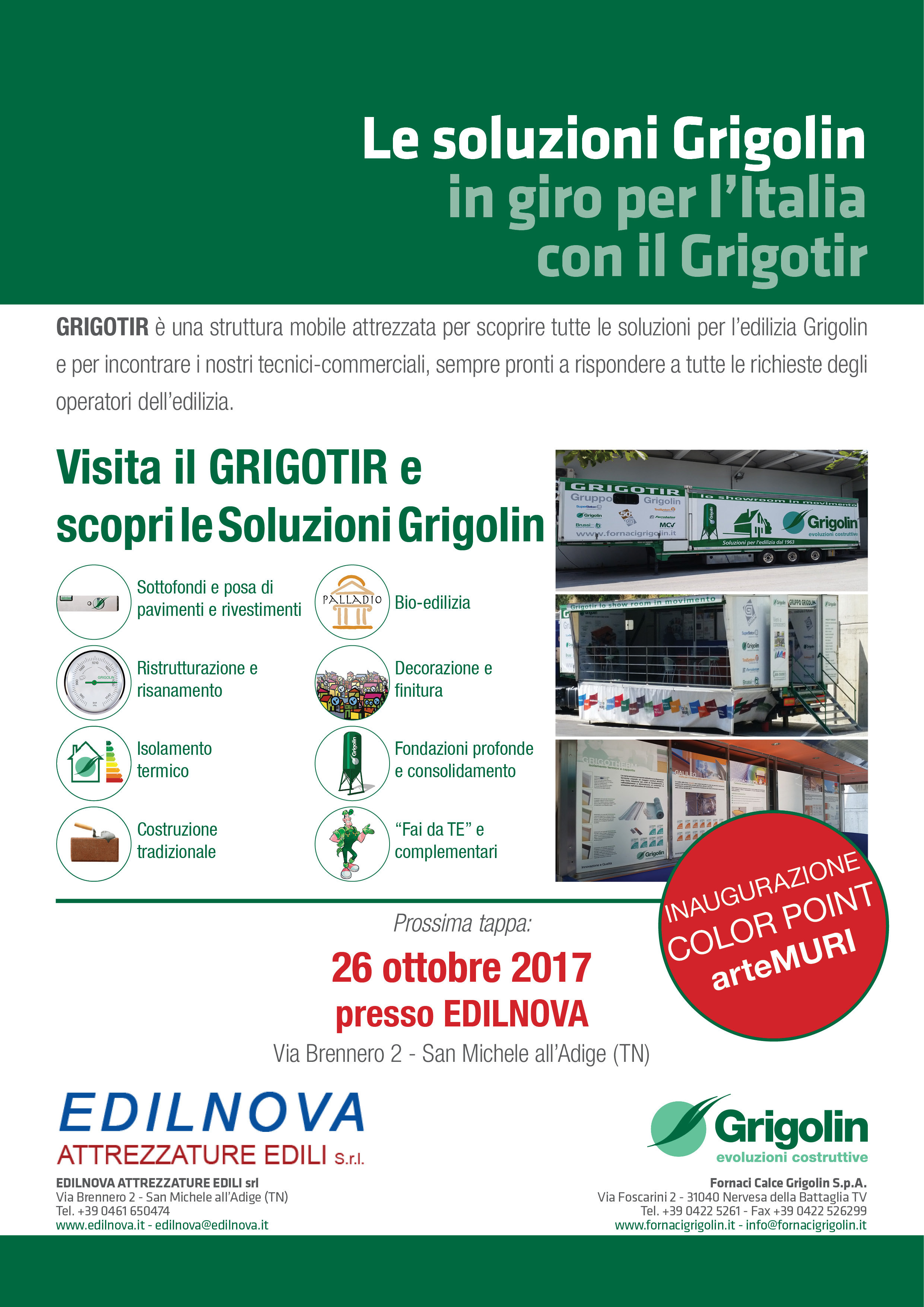 20/10/2017 - Giovedì 26 ottobre 2017 verrà inaugurato un nuovo Color Point arteMURI presso Edilnova Attrezzature Edili. Saremo presenti con il nostro Grigotir, lo showroom Grigolin itinerante.